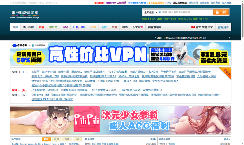 末日动漫资源库(AcgnX末日動漫資源庫)是一个专注于ACG(动画、漫画、游戏)资源的分享平台,主要提供动漫、漫画、游戏等内容的BT种子、磁力链接下载服务。网站成立于2010年代中期,由AcgnX项目维护,资源免费且更新迅速,覆盖华语圈内大量番剧、OVA、生肉、BD高清资源。类似于萌番组,但资源库更全面,包含更多粉丝字幕组作品。由于版权敏感性,该站点对大陆IP有访问限制,建议使用VPN或代理访问。