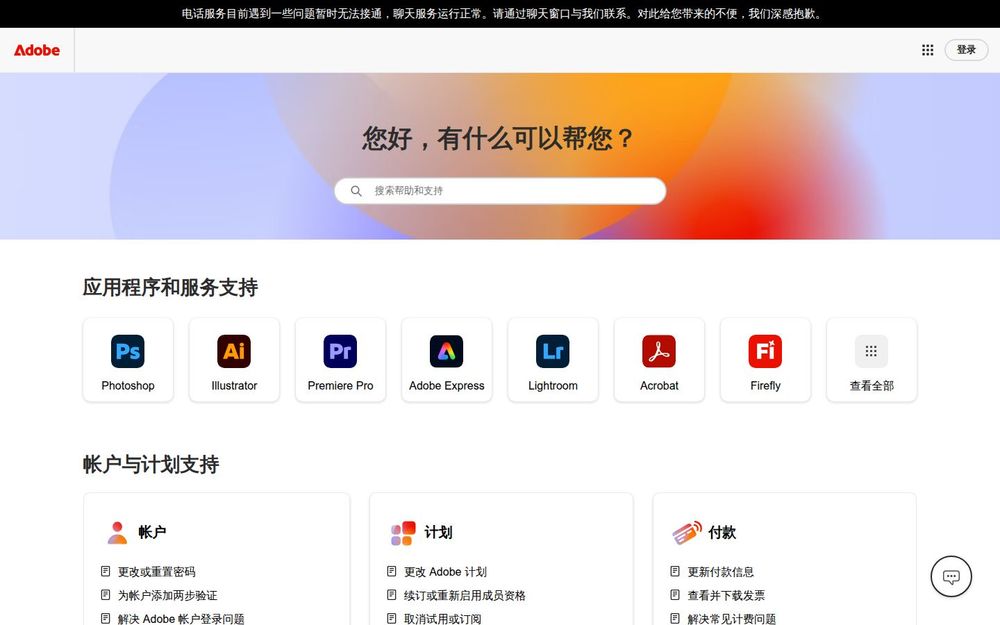 全面的产品支持: 提供包括 Photoshop、Illustrator、Premiere Pro、Lightroom、Acrobat、Firefly 等在内的大量产品帮助页面,按产品分区列出教程、常见问题和下载链接,便于快速定位问题源。
