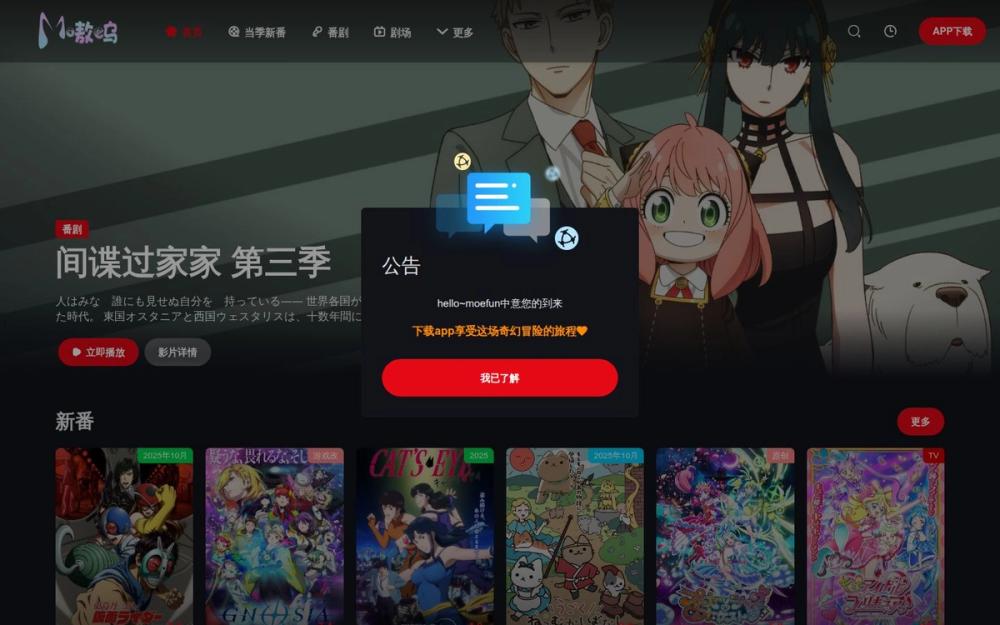 嗷呜动漫(aowu.tv)是一个以动画内容为核心的中文网站,面向喜欢追番、查看剧集信息与快速进入播放页面的用户。网站首页按类别展示“当季新番”、“番剧”和“剧场”等板块,配有封面图、分类标签与更新话数,用户可以通过索引快速找到目标作品并进入播放或详情页。平台还提供APP下载入口、搜索功能、播放记录与签到奖励体系,强调便捷性与日常使用场景。