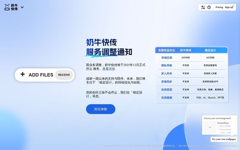 奶牛快传以其简单易用的界面和高效的文件传输能力,成为了许多用户的首选工具。无论是日常的文件分享,还是团队协作中的资料传递,奶牛快传都能提供流畅的体验。随着业务的调整,奶牛快传将于2025年12月停止服务,用户可以转向「稿定设计」继续享受优质的服务。