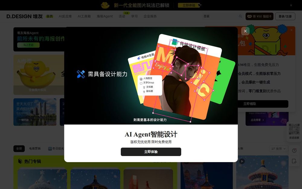 堆友(d.design)是一个面向设计师、创作者与产品团队的在线创作平台,融合了多风格AI绘画、多功能AI工具箱与3D素材在线渲染等能力,旨在降低创作门槛并加速从灵感到成品的过程。平台强调免费商用与社区驱动,通过比赛与展示激发创意交流与成长。
