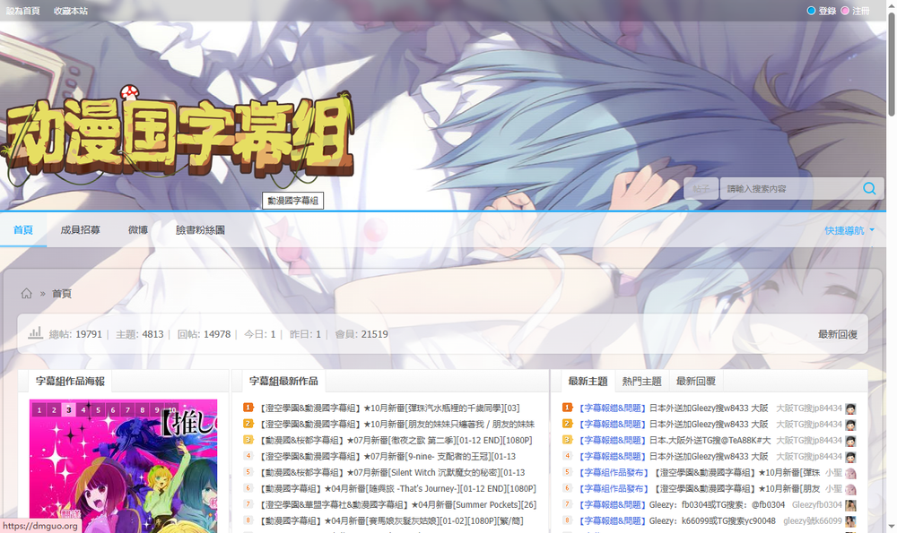 资源类型:新番动画(日语原声+简中字幕)、季度合集、BD/HEVC高清压制,涵盖日常、校园、科幻等多种题材;偶尔涉及漫画资讯或同人讨论。 翻译风格:注重忠实原作、流畅自然的中文化,避免生硬机翻;成片质量高,常使用自定义字体和双语选项。 搜索方式:在资源站如动漫花园(DMHY)或爱恋动漫中搜索“动漫国”标签,即可找到他们的发布;支持季度筛选(如2025秋季新番)。 社区元素:活跃于Facebook官方页面(用于公告、报错反馈)和论坛(成员交流、招募);微博账号(@dmguosub)分享更新。 当前状态:持续活跃,2025年10月已发布如《朋友的妹妹只喜欢烦我》等新番;官方论坛dmguo.org目前显示数据库错误,可能在维护中。 访问地址: Facebook: https://www.facebook.com/dmguosub/(21k+粉丝,最新动态)。 微博: https://weibo.com/dmguosub。 资源追踪: https://dmhy.b168.net/topics/list/team_id/303(动漫花园团队页)。 作品年表: https://mikanani.kas.pub/Home/PublishGroup/18(Mikan Project)。