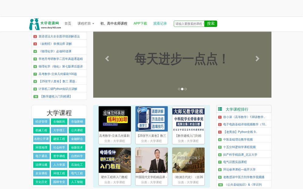大学资源网(dxzy163.com)是一个以课程资源聚合为核心的教育类网站,主打“自我提升”的学习理念。网站涵盖从小学到大学的完整学段课程,同时包含计算机、考研、资格考试、外语、讲座等多类别内容,提供大量视频教学、课程合集和专题系列。页面以课程分类目录、最新课程展示、以及各类榜单为主要导航手段,方便用户快速定位需要的学习资源。