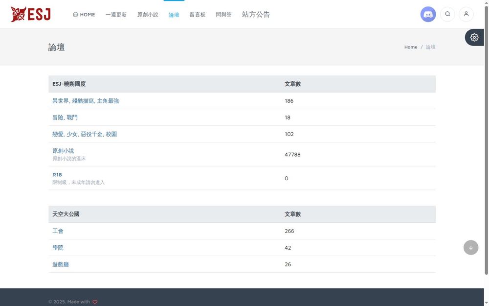 ESJ论坛 网站介绍(Galgame & ACG小说资源平台) 网址:https://esjzone.org/(ESJZone,全球直连,但中国需 VPN 访问完整内容) (一个专注于 Galgame 小说、视觉小说和 ACG 资源的开源社区平台,成立于 2020 年代初。截至 2025 年 11 月,该站活跃维护,月访问量数万,主要用户为二次元小说爱好者。GitHub 备份工具显示其小说资源备受重视。) 网站概述 ESJZone(简称 ESJ 论坛)是一个小型、开源的 ACG 资源分享站,以 Galgame 小说备份和汉化资源为主,涵盖视觉小说、轻小说、CG 提取和游戏补丁。站点由社区开发者维护,强调小说内容的备份与分享(如通过 GitHub 工具 ESJ-novel-backup),避免资源丢失。内容多为用户上传的 Galgame 衍生小说、攻略和存档,总资源超过数千件。网站简洁无广告,适合 Galgame 党找小说资源或备份收藏。 它在 ACG 导航(如 ACG 盒子、鲲 Galgame 论坛)中被提及,但非主流大站,更多是小众爱好者的“私人仓库”。