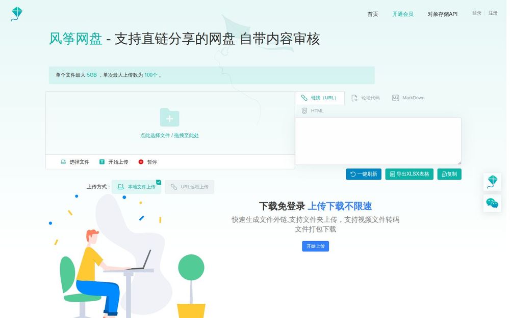 - 大文件支持: 单个文件最大可达5GB,单次上传数量可达100个,适合大文件传输需求。