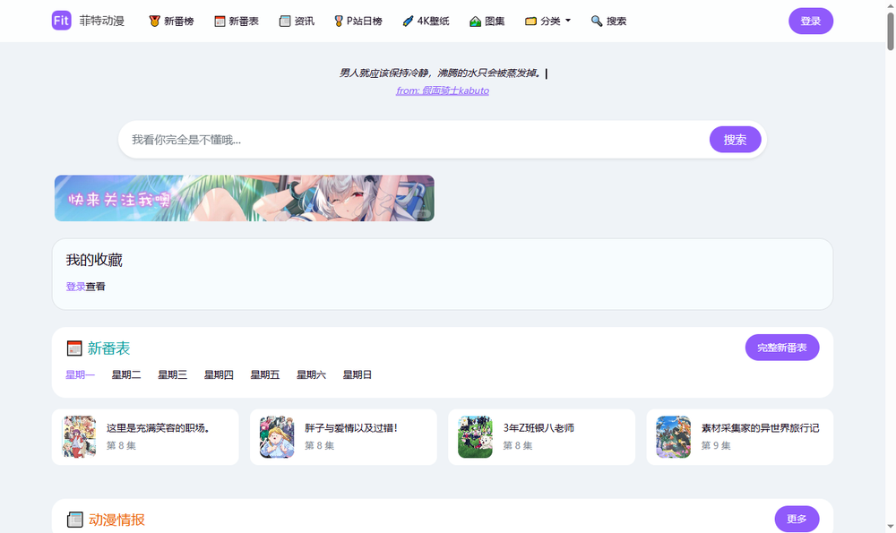 资源类型:新番动画(720p/1080p中字、BD压制)、日剧合集、动画音乐下载、RAW生肉、壁纸合集等,涵盖科幻、日常、热血等多种题材。 搜索方式:支持关键词搜索、分类浏览(如“动画”“日剧”“音乐”)、季度筛选,资源检索快速,支持标签过滤(如“HEVC”“NC-RAW”)。 社区元素:用户可上传分享,关联Telegram频道(用于公告和资源推送),无活跃论坛但有联系邮箱(ioiopaygood@gmail.com)。 访问限制:大陆IP可能需VPN翻墙;域名稳定,但备用镜像常见于导航站。 当前地址:https://fitacg.com/(主站,SSL证书有效)。