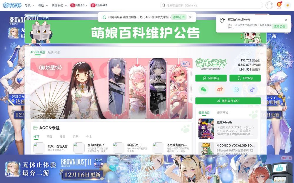 - 海量条目与专题集合: 收录作品条目、角色、声优、音乐、梗与萌属性等多维内容,配有专题导航与分类索引,便于系统化查找。
