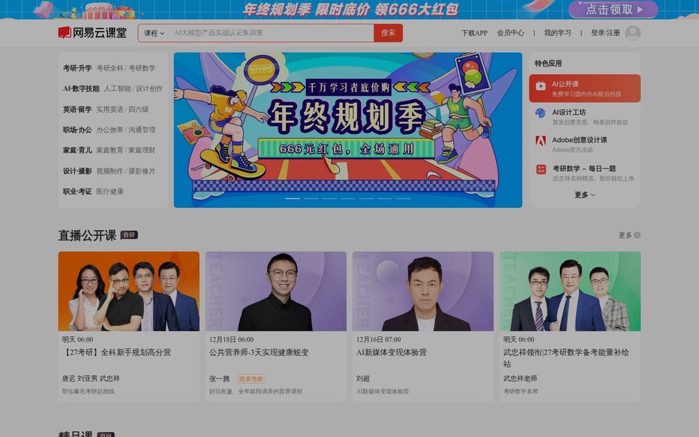 课程推荐与专题策划: 平台会根据热点与行业需求推出专题(如AI应用、考研系列、设计必学合集等),并提供精选好课与免费课程供学员试学。