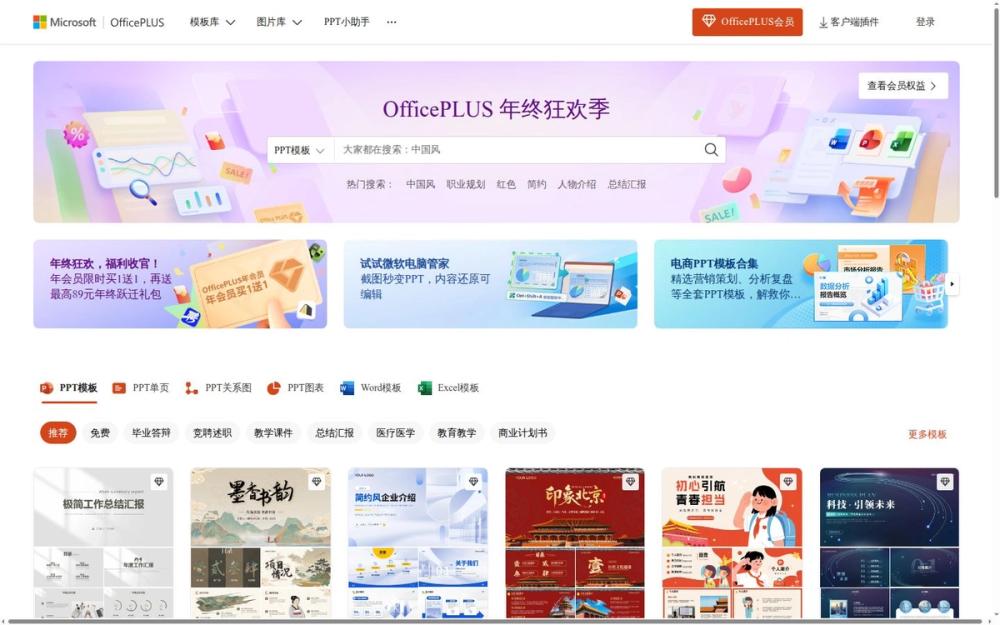 OfficePLUS 是微软旗下面向办公与教学场景的资源平台,旨在为用户提供海量的模板与设计素材,并通过插件和智能工具提升内容创建效率。平台覆盖 PPT、Word、Excel 三大办公文档类型,同时提供图片库、关系图、图表、字体等素材,以及论文查重折扣和 PDF 转换等增值服务,为不同需求的用户提供一站式支持。
