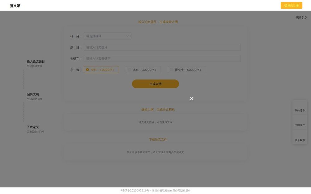 范文喵是一款面向学生与研究工作者的AI论文辅助工具,覆盖从选题到成稿的主要流程。用户可以在平台上输入论文题目、科目、关键字和目标字数,系统自动生成多级大纲,支持逐步编辑与扩展,最终生成论文初稿并导出为完整论文或PPT文件。平台页面包含版本切换、订单中心、代理推广与客服入口,适用于不同写作阶段的需求。