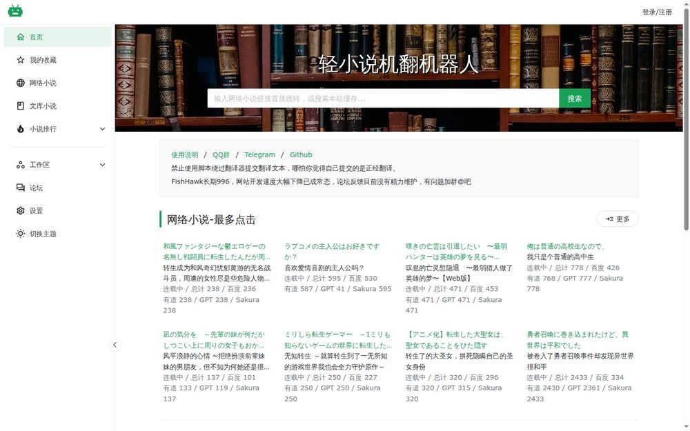 轻小说机翻机器人是一个专注于网络小说翻译的在线平台,旨在为用户提供便捷、高效的翻译服务。用户可以通过输入网络小说链接,快速获取翻译结果,或通过搜索功能查找本站的缓存内容。该平台的目标是让更多的用户能够轻松阅读到各种网络小说,打破语言的障碍。