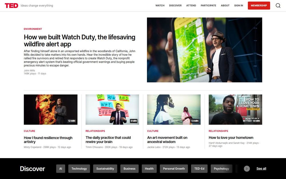 海量演讲库: TED 拥有数以千计的演讲视频,覆盖从科学研究到个人成长的广泛主题,用户可以按“Newest/Popular/Topic”等维度筛选与浏览。