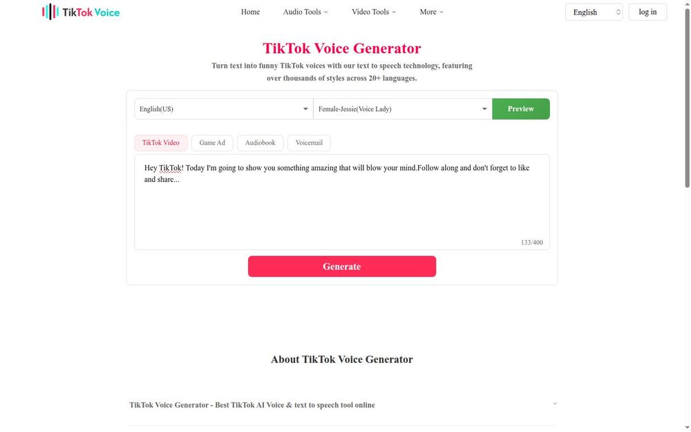 - 支持多种语言: TikTok Voice Generator 支持多种语言和口音,满足全球用户的需求。