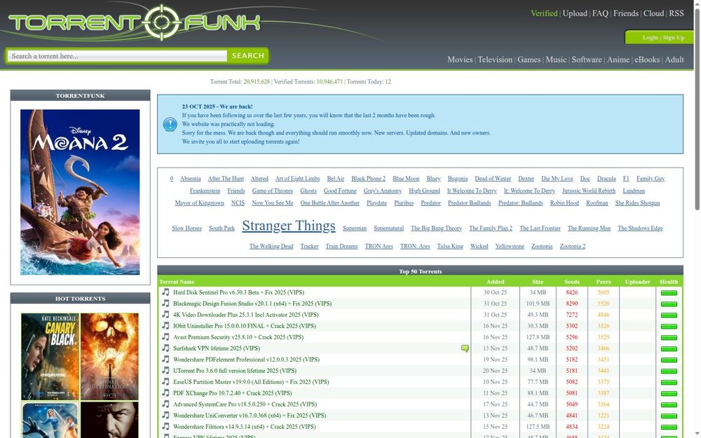 TorrentFunk 是一个专注于提供高质量种子下载的平台,用户可以在这里找到各种类型的资源,包括电影、电视剧、软件等。网站的种子总数超过 20,915,628 个,经过验证的种子数量达到 10,946,471 个,确保用户能够找到可靠的下载资源。