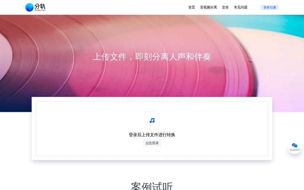 分轨是一款创新的在线音频处理工具,旨在帮助用户轻松分离音频文件中的人声和伴奏。无论是音乐制作、教学还是个人娱乐,分轨服务都能提供高效、便捷的解决方案。