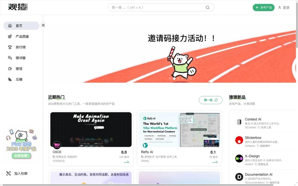 作为一个以 AI 为核心主题的中文社区与产品目录,观猹在内容聚合、用户评测、榜单推荐和活动联动上具备明显优势。无论你想发现新工具、参与讨论还是关注行业活动,观猹都能提供便捷且有温度的信息入口。