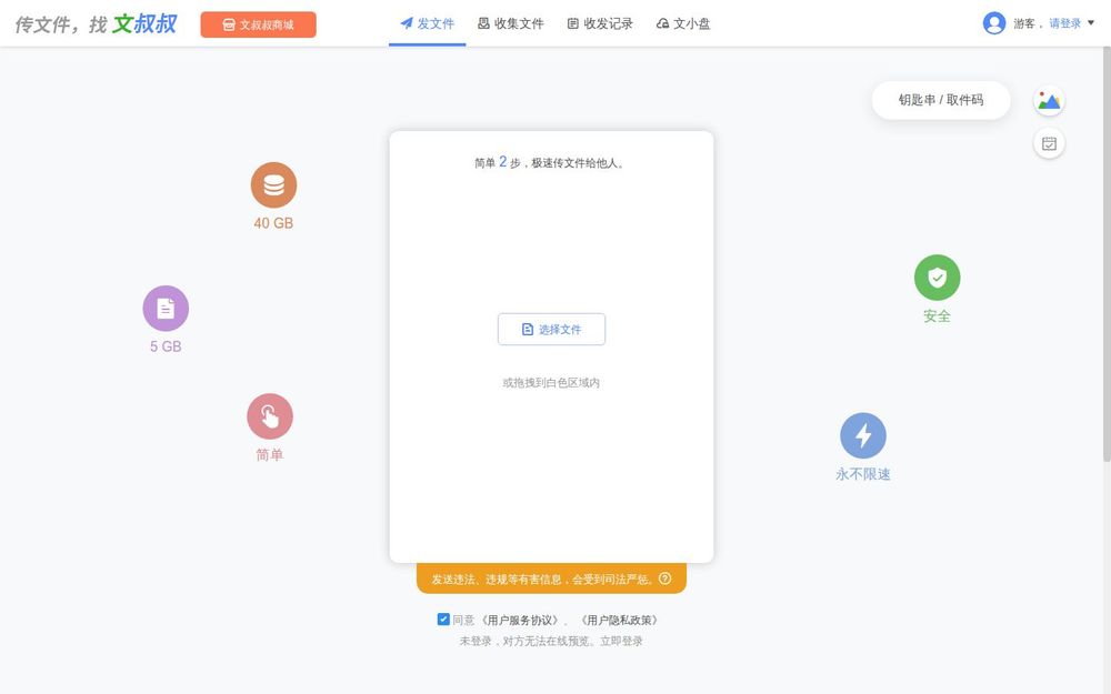 文叔叔是一款创新的网盘(云盘)产品,致力于为用户提供高效、安全的文件存储和传输服务。用户可以免费获得高达40GB的云存储空间,支持多种文件类型的上传和下载,满足个人和团队的需求。