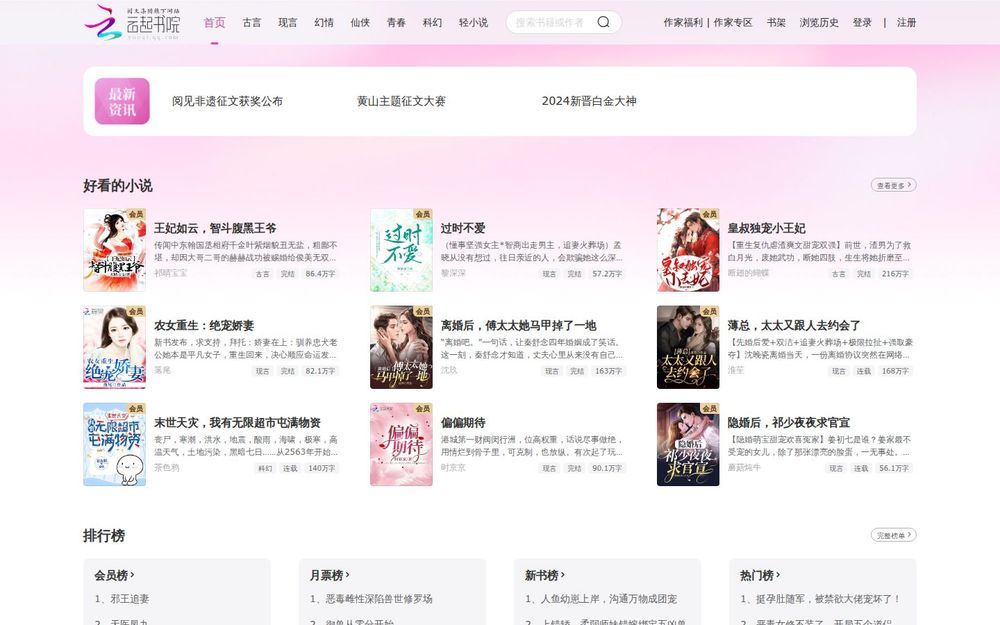 榜单与内容发现: 通过会员榜、月票榜、新书榜、热门榜等多维排行榜以及专题栏目,帮助读者快速发现当前热门和高质量的新书,提升内容曝光与阅读转化。